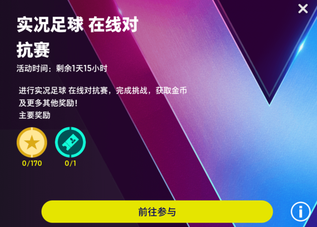 参与并完成【实况足球 在线对抗赛】,你将赢得【金币】和【高光定向券】作为参赛奖励。快来参加这场激烈的对抗吧!