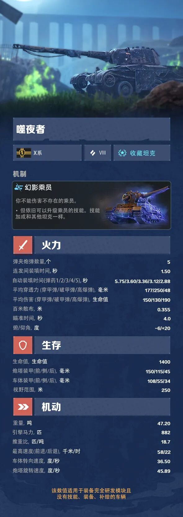 VIII级噬夜者坚固的炮塔设计使它无惧敌人慌乱下的任何盲目攻击。此外,由于“幻影乘员”机制的作用,敌方武器也无法对车内乘员造成任何有效的伤害——亡者不知痛楚为何物。