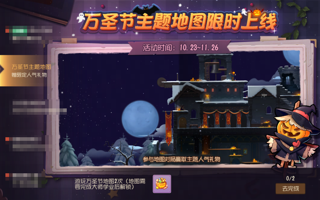 万圣节主题地图限时上线!活动期间游玩主题地图2次,即可获得万圣节主题人气礼物!