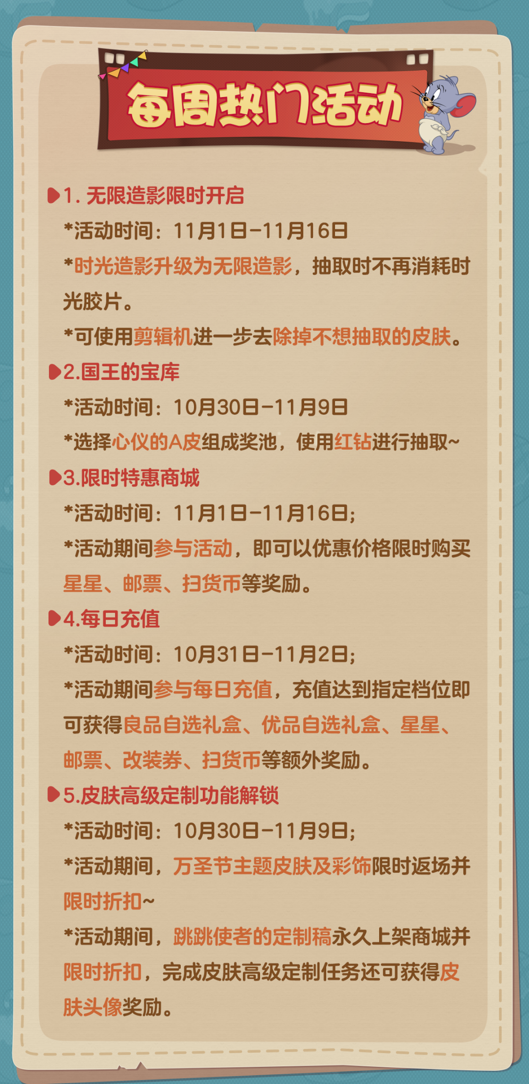 以上就是本周(10月30日)更新维护的全部内容啦!感谢小伙伴们对于《猫和老鼠》手游的支持和喜爱,愿欢乐永远陪伴大家左右!