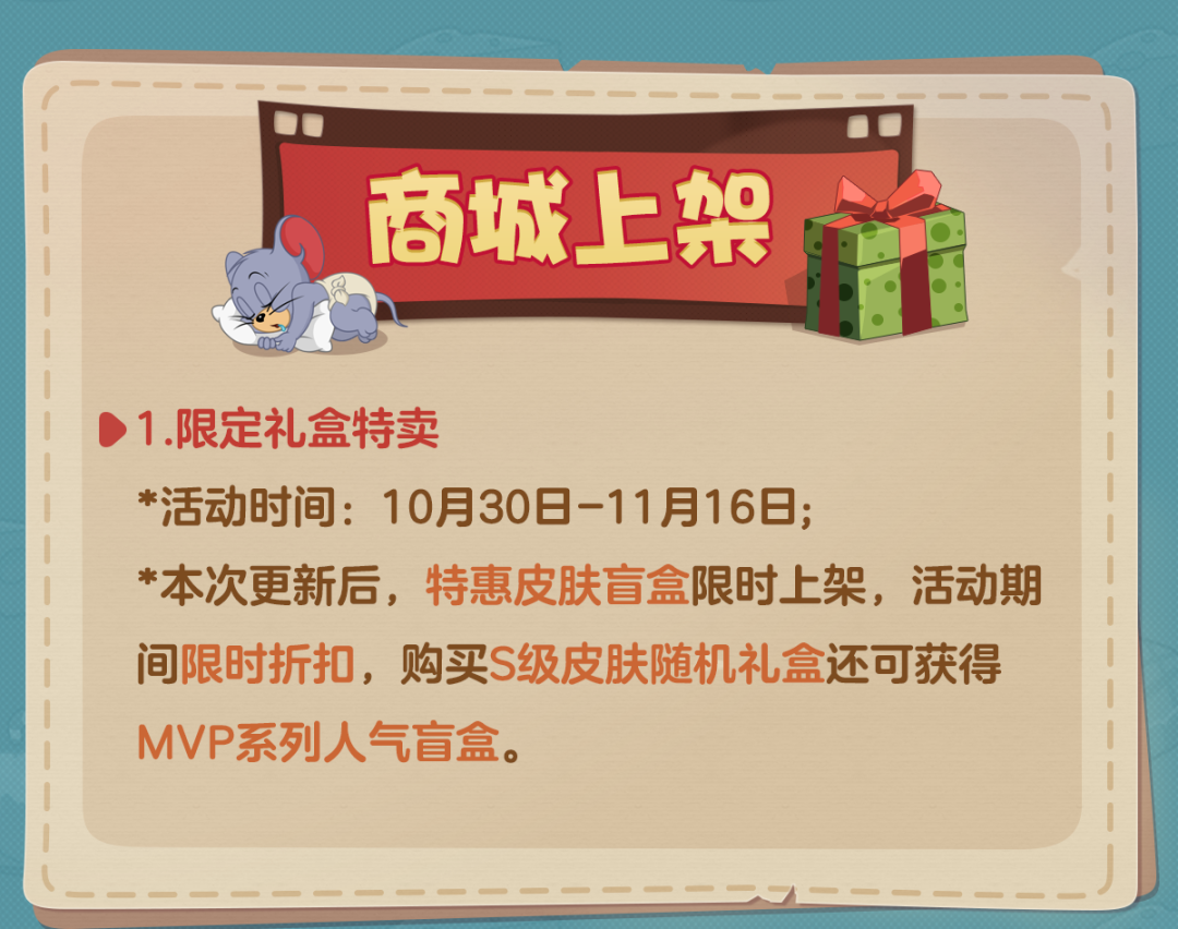 *本次更新后,特惠皮肤盲盒限时上架,活动期间限时折扣,购买S级皮肤随机礼盒还可获得MVP系列人气盲盒。