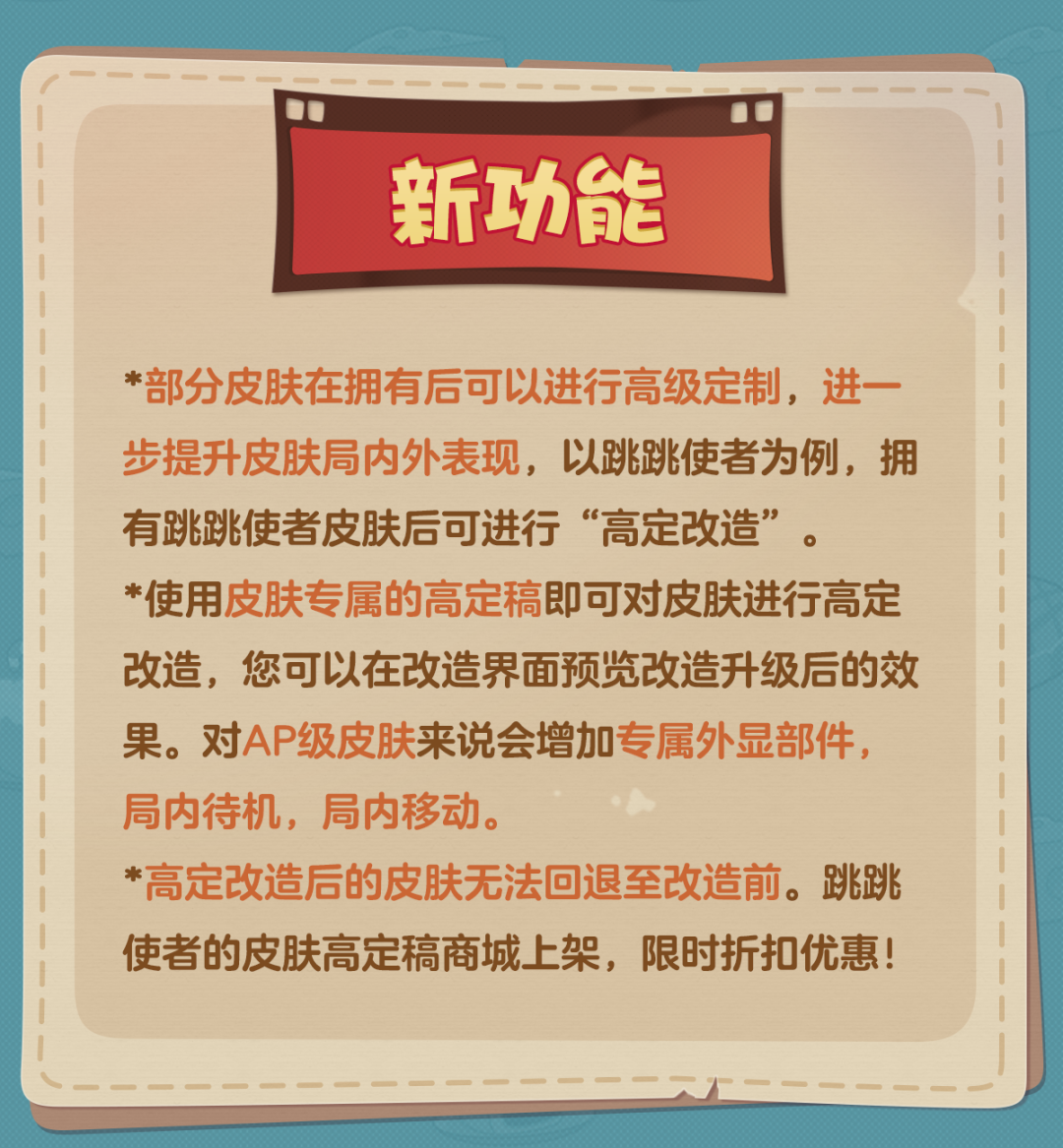 *活动期间,跳跳使者的定制稿永久上架商城并限时折扣,完成皮肤高级定制任务还可获得皮肤头像奖励。