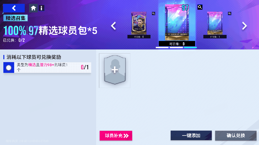 【97精选随机包】阵容召集挑战将于11月18日11时至11月21日11时开启。活动期间每日可进行2次召集挑战,按条件使用1个98精选球员进行召集,可拆分获得5个【97精选随机包】。