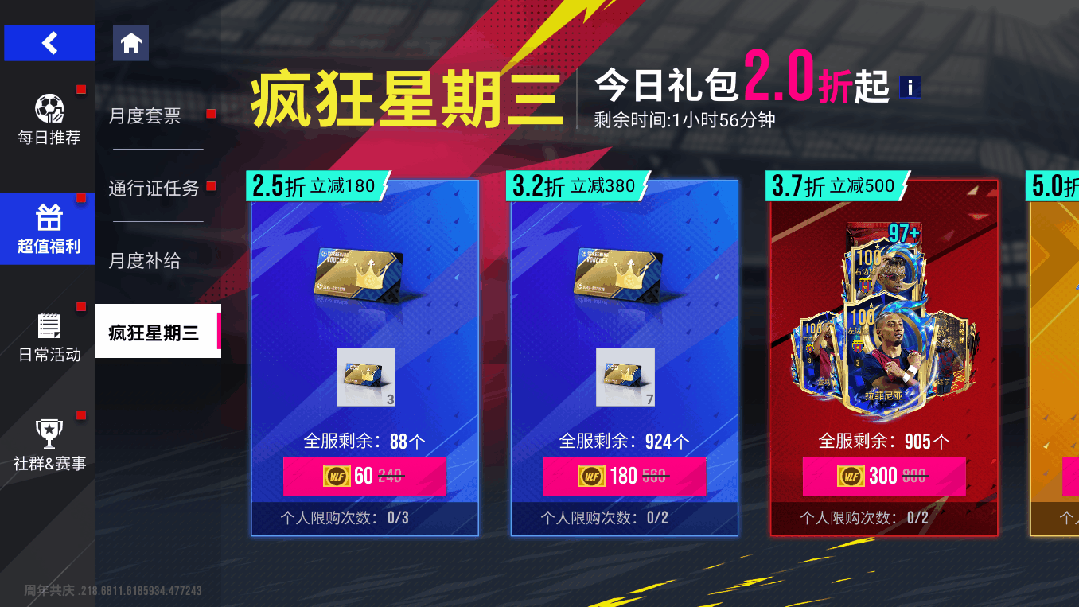 【疯狂星期三】仅在周三12-14时、18-20时与21-23时开启,全服玩家都可参与,活动期间可用超低价购买超值商品,每件商品均有限购数量,售完即止。