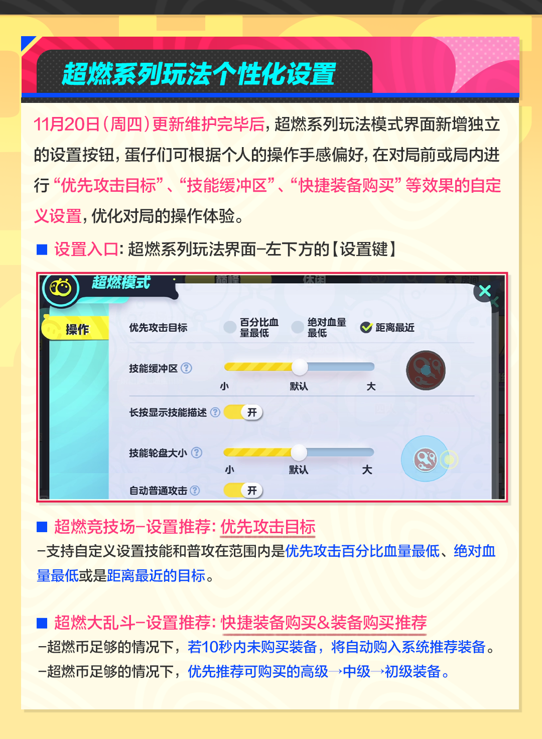 11月20日(周四)更新维护后,部分超燃蛋仔迎来强度调整和优化。此外,新增超燃系列玩法专属设置按键,蛋仔们可根据个人操作偏好进行设置!