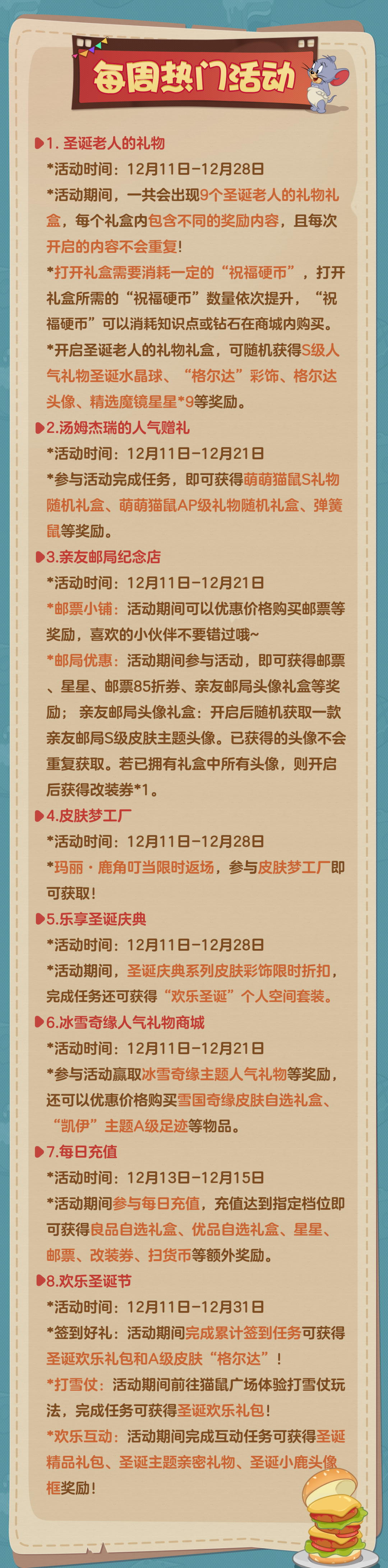 以上就是本周(12月11日)更新维护的全部内容啦!感谢小伙伴们对于《猫和老鼠》手游的支持和喜爱,愿欢乐永远陪伴大家左右!