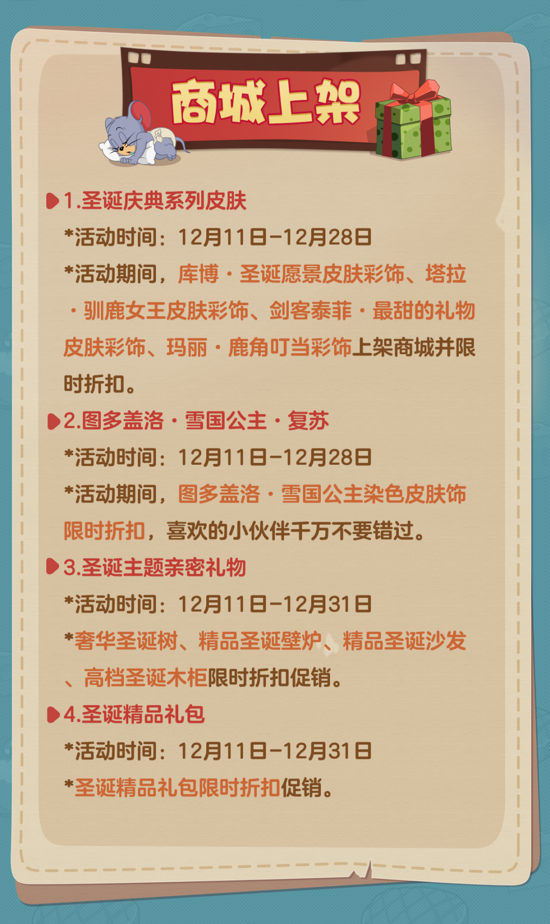*打雪仗:活动期间前往猫鼠广场体验打雪仗玩法,完成任务可获得圣诞欢乐礼包!