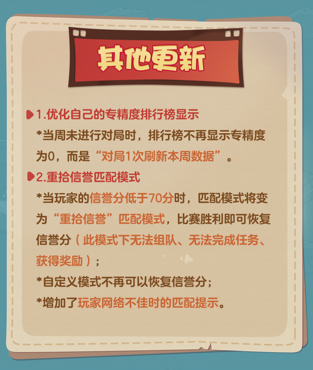 *当周未进行对局时,排行榜不再显示专精度为0,而是“对局1次刷新本周数据”。