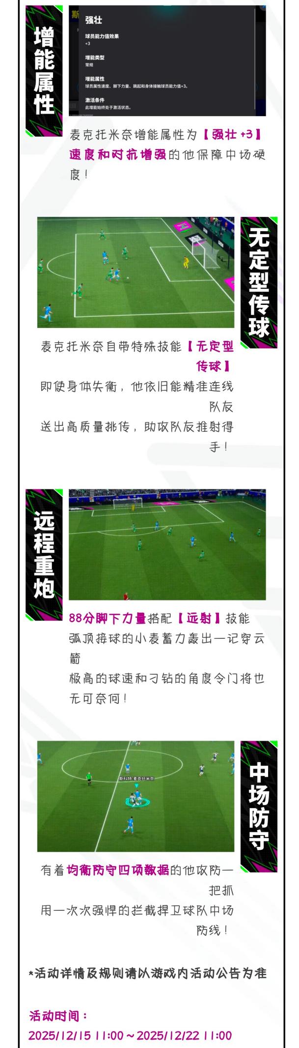 双增能决胜高光麦克托米奈将通过【亚平宁战神 高光 特级经纪人(前3次7折)】返场!除此之外,你还将有机会获得双增能史诗高光德尔皮耶罗、巴雷西、范巴斯滕、博努奇、萨内蒂、菲奥雷。想要补强球队的玩家们,千万不要错过此次活动!