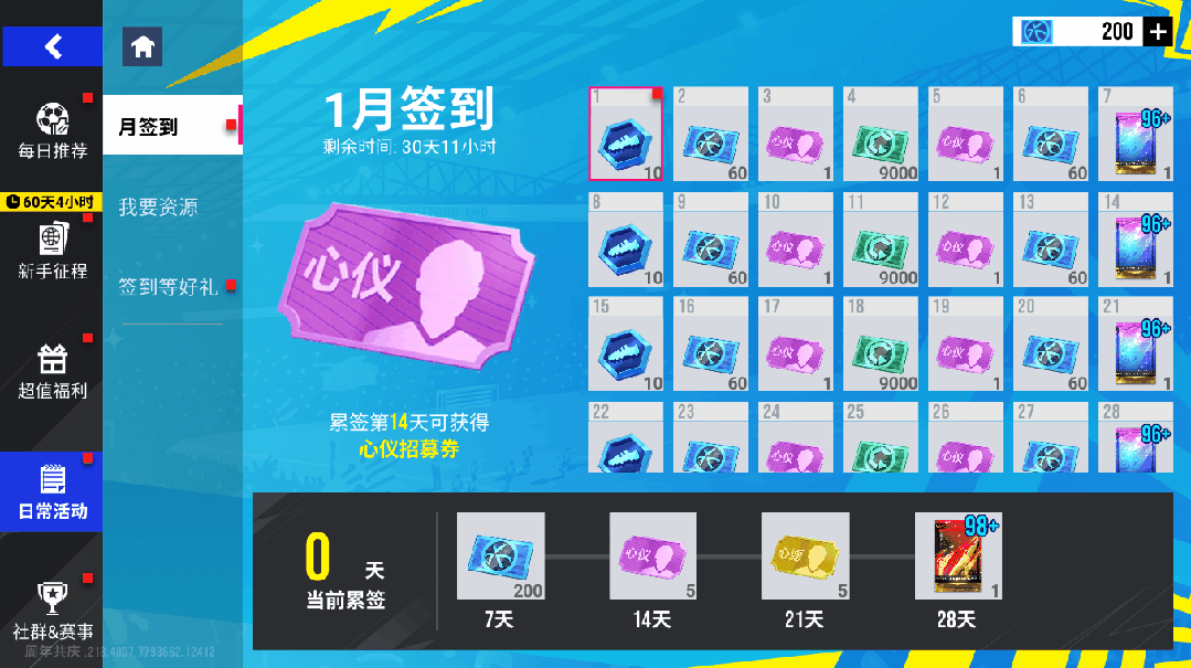 1月1日起,奖励焕新升级,累计签到达指定天数可得【98+巅峰球员包】。