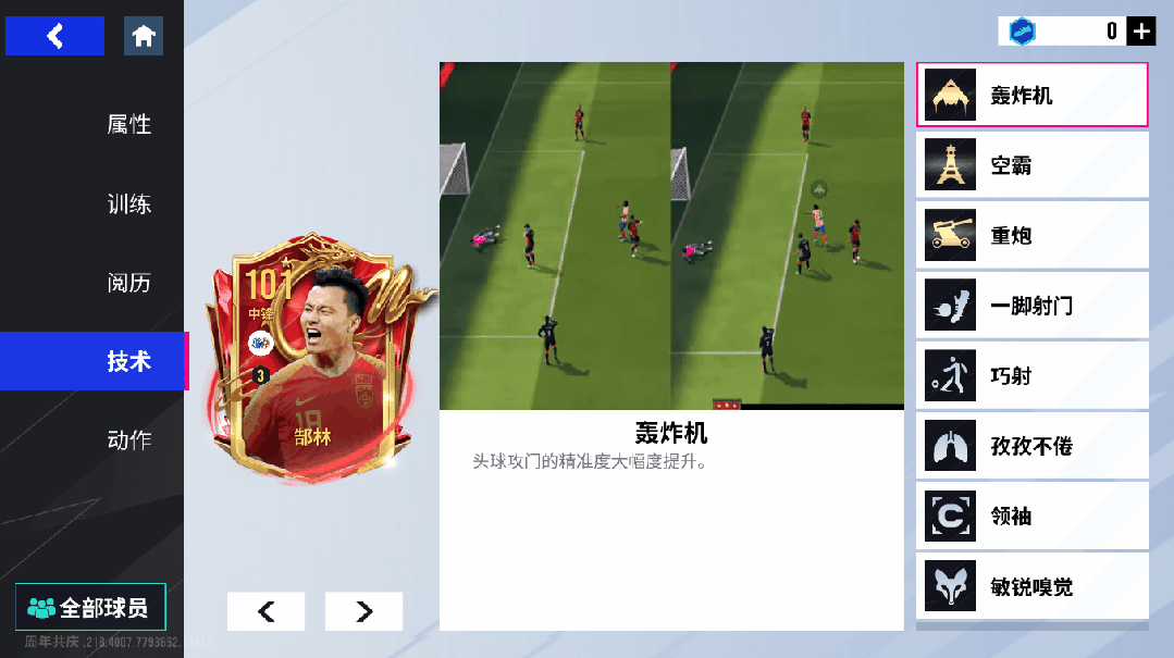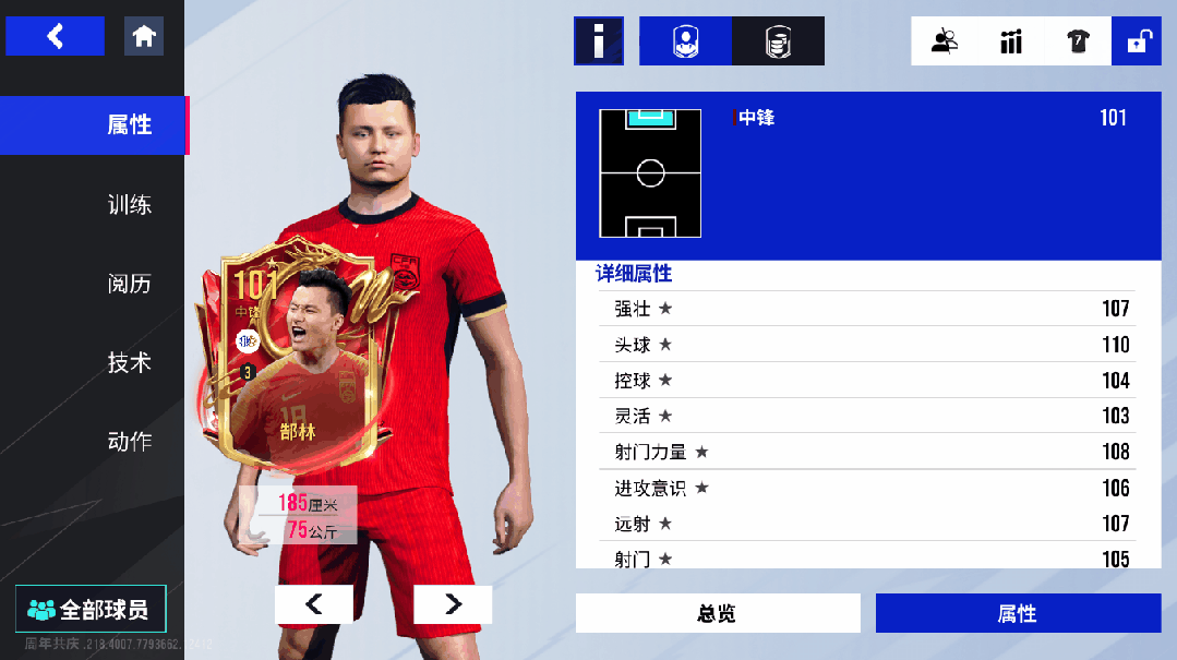这张101潜力巅峰郜林自带金色【轰炸机】技术金色【空霸】技术,他在禁区内的空中对抗与统治力达到顶峰,能稳稳压制后卫,将任何高空传球转化为进球机会。与此同时,金色【重炮】技术将他108的射门力量107的远射能力彻底引爆。无论是在禁区前沿的突然起脚,还是在外围抓住空当,他的爆射都势大力沉、角度刁钻,是球队打破僵局的强力武器。这与他105的射门106的进攻意识完美结合,确保其拥有顶尖的射手本能与一击致命的效率。此外,他拥有107的强壮身体,能在对抗中护住球权;109的加速103的速度提供了出色的冲刺与摆脱能力;郜林不仅是禁区内的空中霸主,更是能里能外的全能攻击手。他的存在,就是球队进攻端最值得信赖的答案!