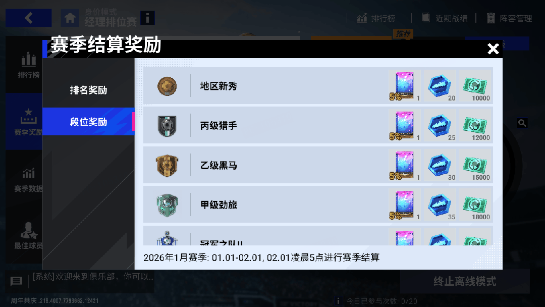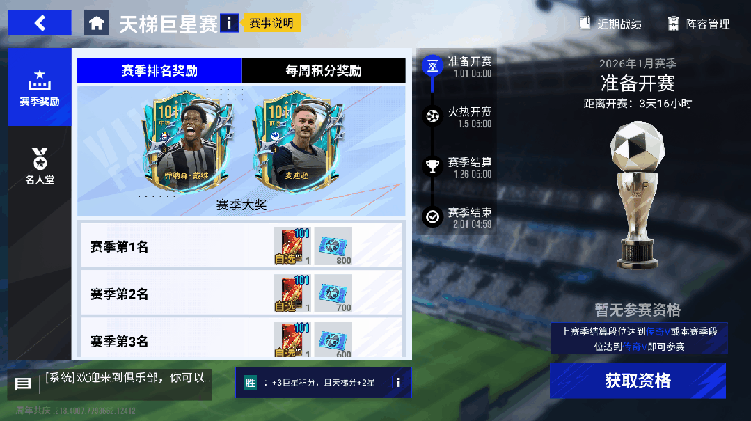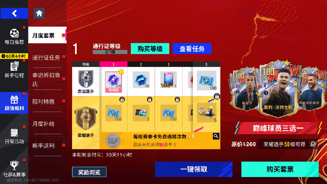 新赛季新奖励,全新套票将于1月1日0时开启,奖励大幅升级,其中包括招募券、球员包等奖励。最终免费大奖可获得99潜力「精选福利自选包」、付费大奖可获得100潜力「巅峰福利自选包」