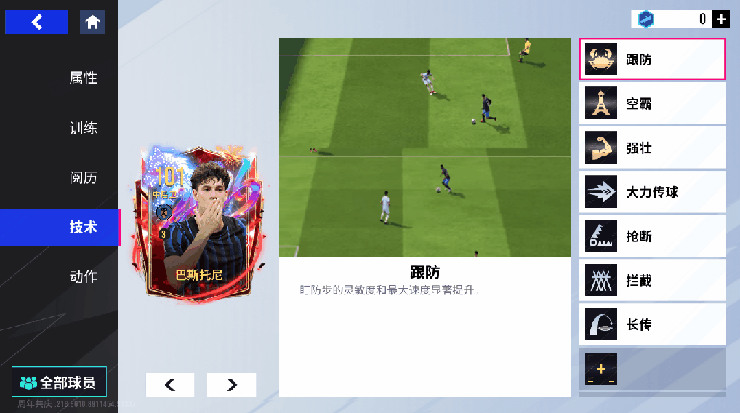这张 101 巅峰巴斯托尼,凭借金色【跟防】技术的加持,以及 109 的抢断107 的拦截属性,将自己的防守能力锤炼得坚不可摧,无论在禁区内贴身盯防,还是在防线前沿预判拦截,都能给对手的进攻带来毁灭性打击。
