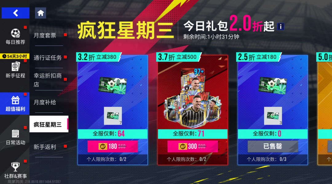 【疯狂星期三】仅在周三12-14时、18-20时与21-23时开启,全服玩家都可参与,活动期间可用超低价购买超值商品,每件商品均有限购数量,售完即止。