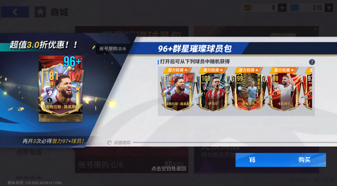 【96+群星璀璨球员包】账号限购6次。打开后可获得96-101潜力球员,打开3次必出97+,更有机会获得【101巅峰道格拉斯·路易斯】!
