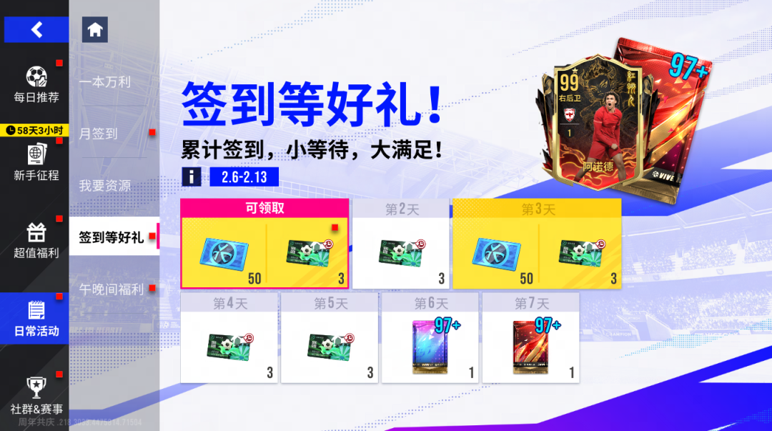 2026年2月6日11时-2月13日11时期间,每日签到即可领取97+巅峰球员包和「转盘券(限时)」等奖励。