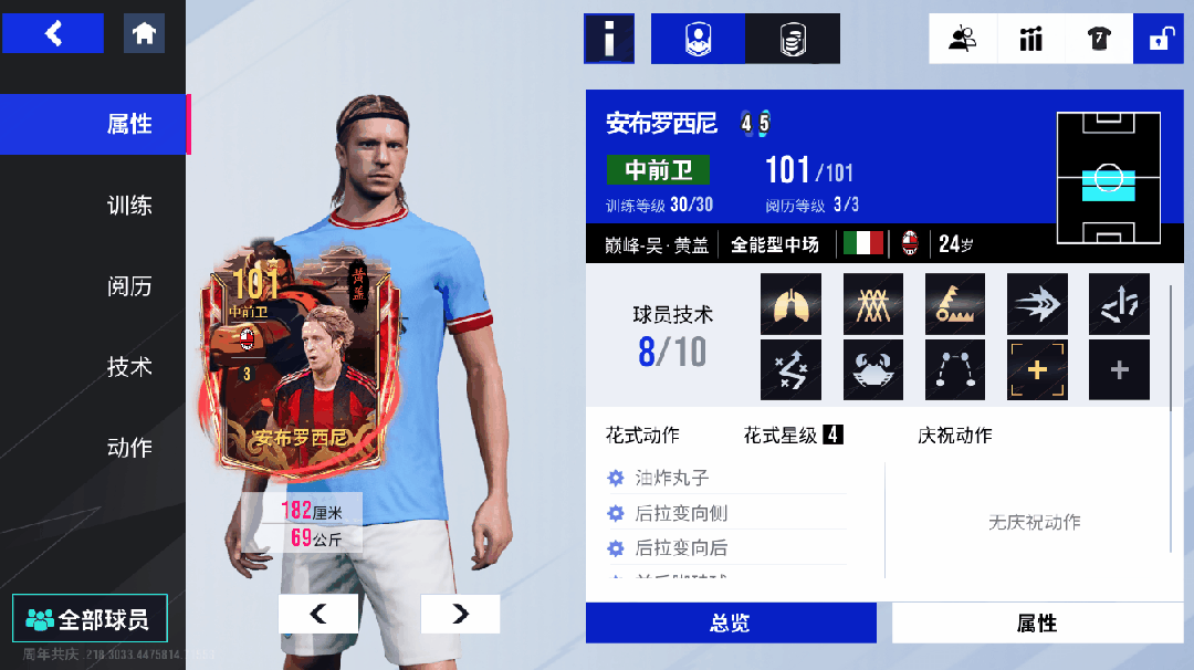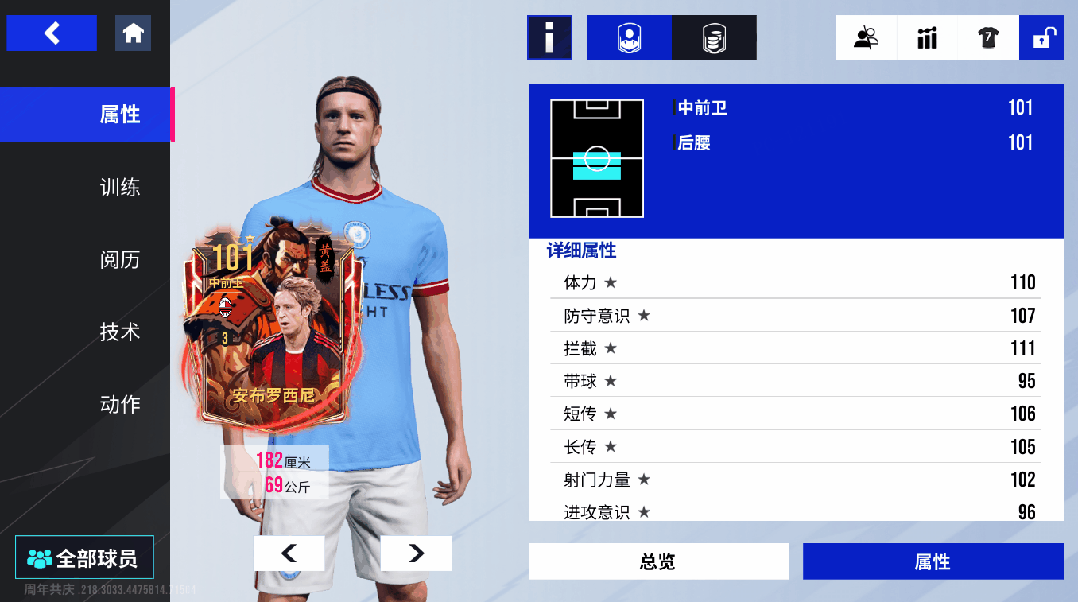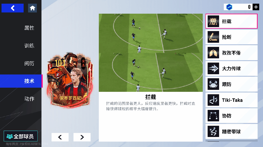 这张 101 巅峰安布罗西尼,凭借金色【拦截】技术的加持,以及 111 的拦截、107 的防守意识属性,将自己的中场防守能力打磨得密不透风,无论是在中路的覆盖拦截,还是在后腰位置的补位断球,都能精准切断对手的进攻线路,成为中场的 “防守屏障”。
