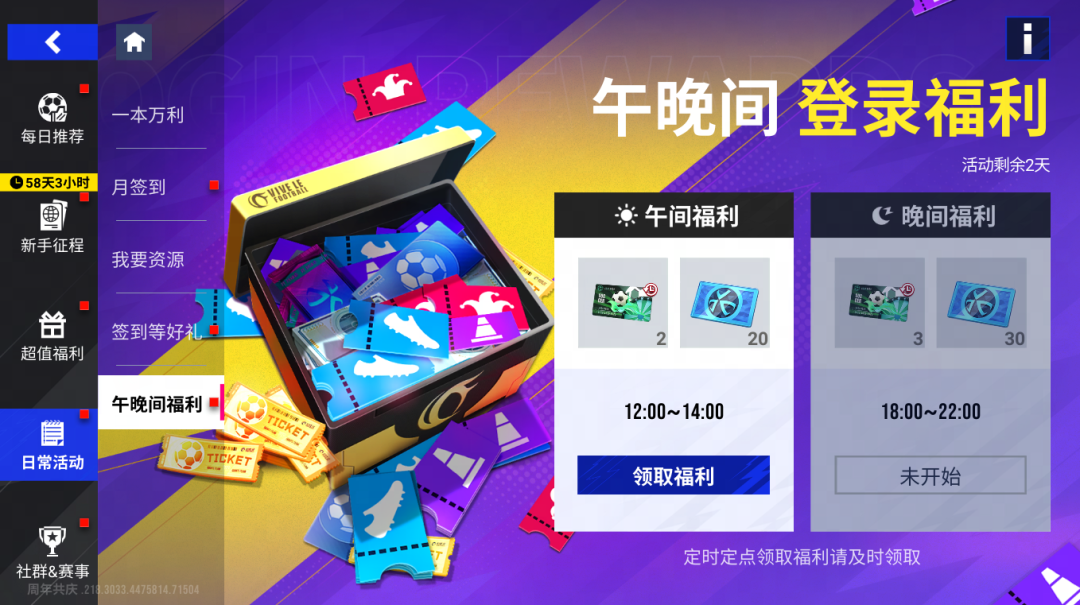 【绿茵新春礼盒】每日登录游戏即可在邮箱随机领取一份【绿茵新春礼盒】!打开即可获得丰厚奖励,最高有机会获得【蓝券*500】、【100巅峰哈弗茨】等奖励!
