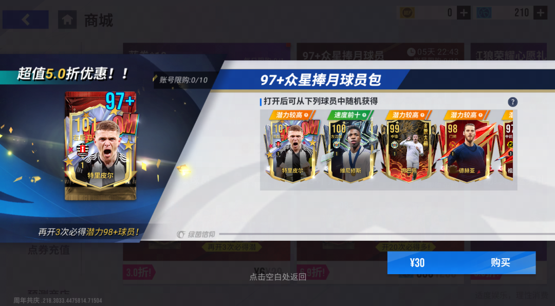 【97+众星捧月球员包】打开后可获得97-101巅峰球员,账号限购10次,开启3次必出【98+巅峰】