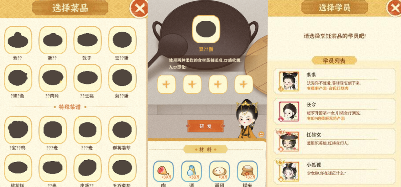 不过在开始烹饪前,需要先在“研发”界面研制新菜品~选择想要开发的菜品后,再选择合适的一位学员,就可以开始研发新菜品啦!对于尚未开发的菜品还会提供特别提示,在坊主们的研发过程中提供参考。