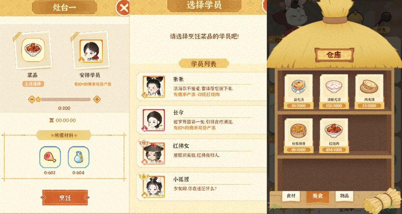 先选择菜品和所需食材,再选择负责的学员,即可开始烹饪。烹饪后的美食会放在仓库的美食一栏中哦~