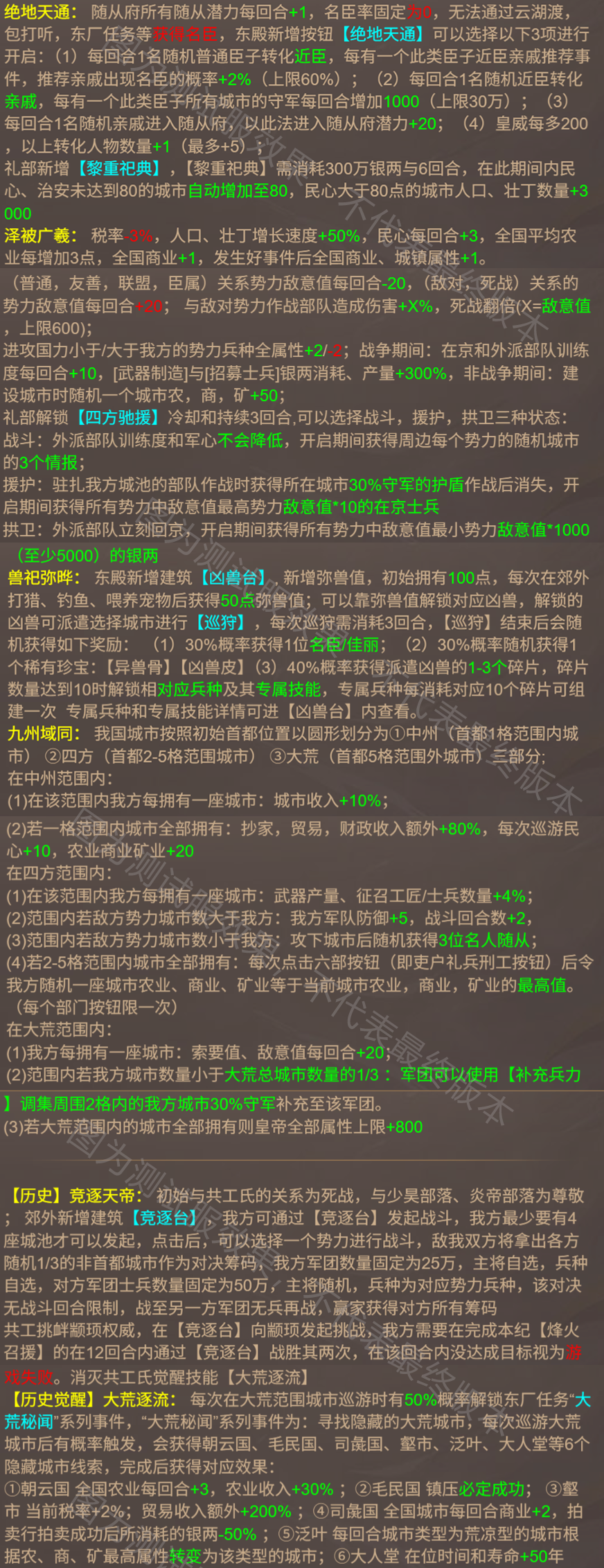 颛顼的统治智慧,体现在对“内外平衡”与“战争经济”的精妙把控上。您的王朝享有内政红利,并能将农业丰收的成果自然转化为商业繁荣。在对外关系上,您将体验将“敌意”本身转化为战争武器,根据国力对比灵活调整战略,在战时以超高效率暴兵备战,在和平时期则享受发展带来的随机馈赠。礼部解锁的“四方驰援”支持您根据需要随时切换全国军力状态,或获取情报,或增强防御,或快速聚财,展现中央对四方力量的强力调度。