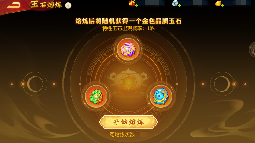 主公在熔炉中放入三个任意的红色特性玉石,能够熔炼出一个随机的金色品质玉石。已被武将穿戴的红色特性玉石无法参与熔炼。主公在一期活动中最多可以使用红色特性玉石熔炼3次,每次活动开启时重置,还请主公谨慎选择哦。