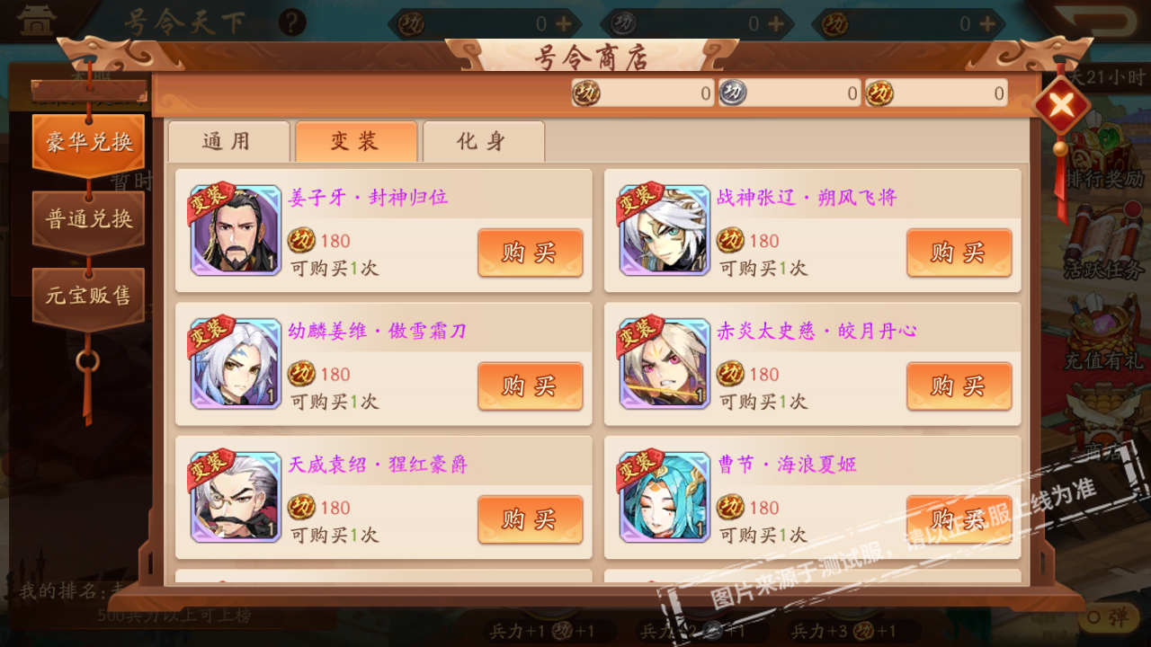 姜子牙、战神张辽、幼麟姜维、赤炎太史慈、天威袁绍、曹节、诸葛果、孙鲁班、吕玲绮紫金武将变装,以及金色武将变装;