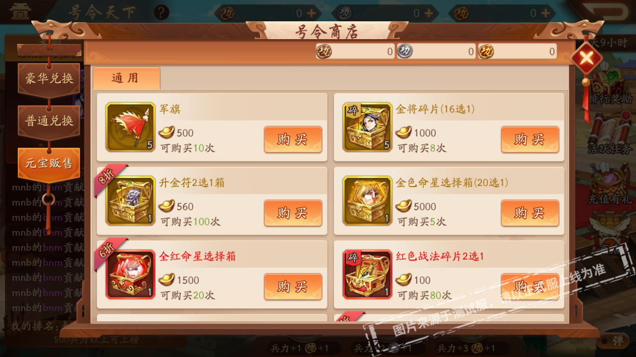 活动4:元宝贩售开启,直购金将碎片活动期间,少年们可以消耗元宝也可直接购买军旗、金将碎片(16选1)、金命星选择箱(20选1)、红色战法碎片2选1、洗炼晶石、手卷、进阶石、兵符灵印、移形换影石、斗转星移石、