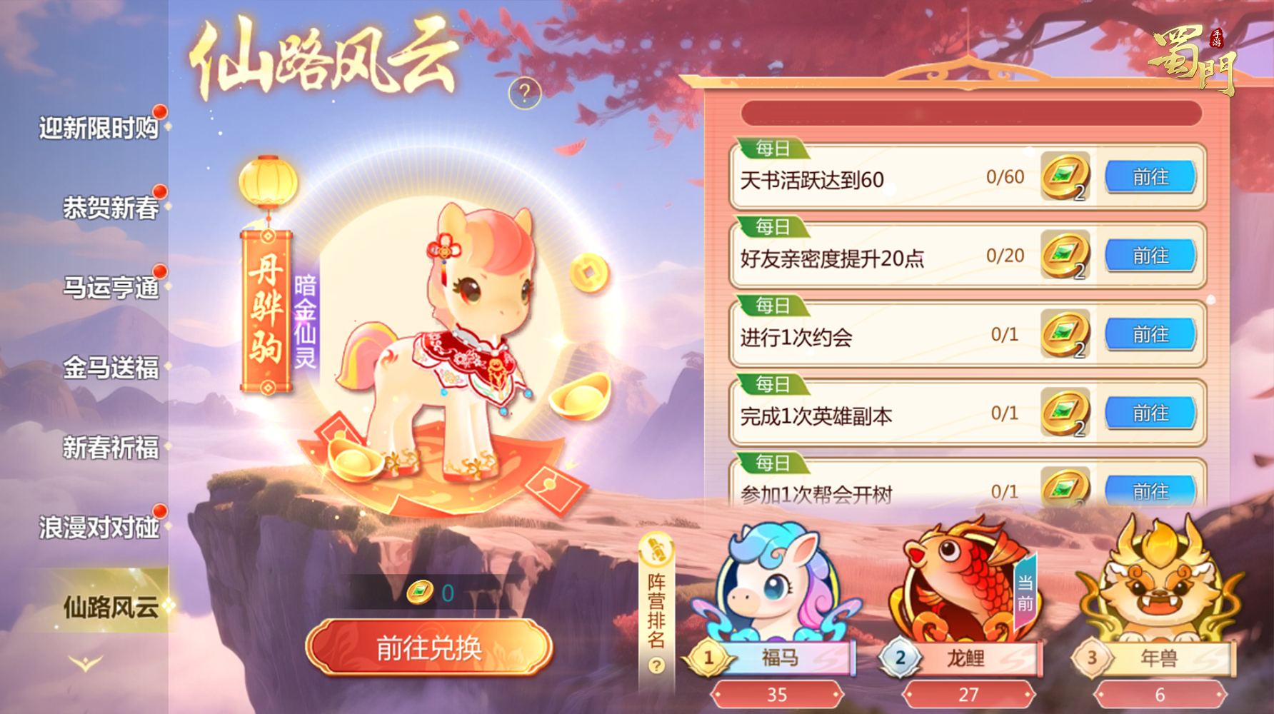 活动内容:活动期间,全服玩家将会被随机分配至福马、龙鲤、年兽中的任意一个阵营,完成日常任务就可以为自己的阵营获得累计积分,