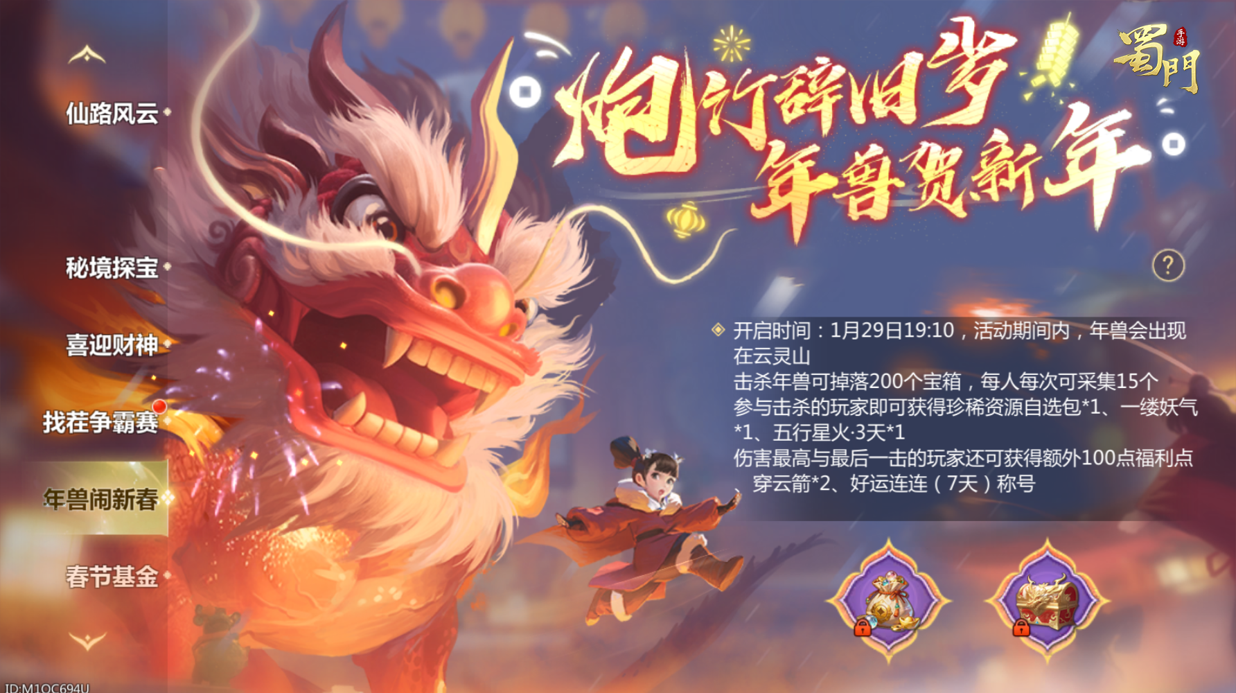 活动内容:爆竹声中辞旧岁,快来围猎年兽迎新春!活动期间,年兽将会出现在云灵山,击杀年兽将掉落200个年兽宝箱,每人每次可采集15个。