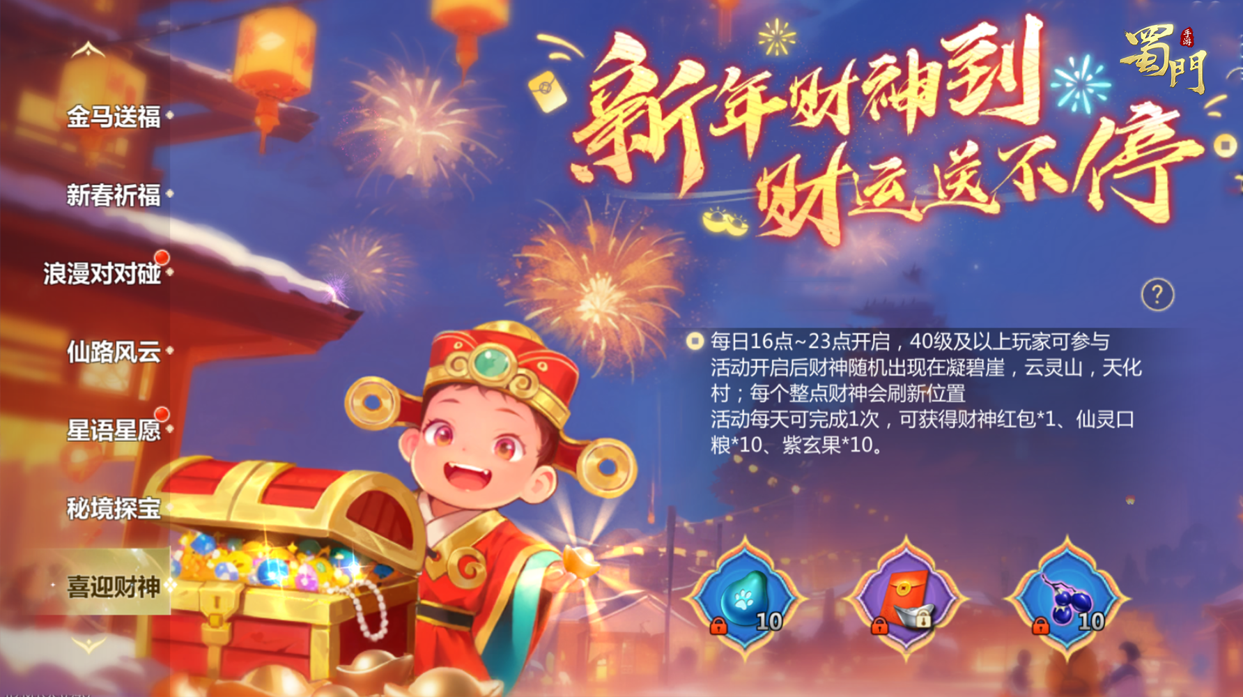 活动内容:我们熟悉的云缘化身成小财神,给大家送财啦~活动期间,每日16:00-23:00期间财神会随机出现在凝碧崖、云灵山、天化村三处地方,找到她后,可获得财神红包*1、仙灵口粮*10、紫玄果*10,打开财神红包有机会获得海量绑银。