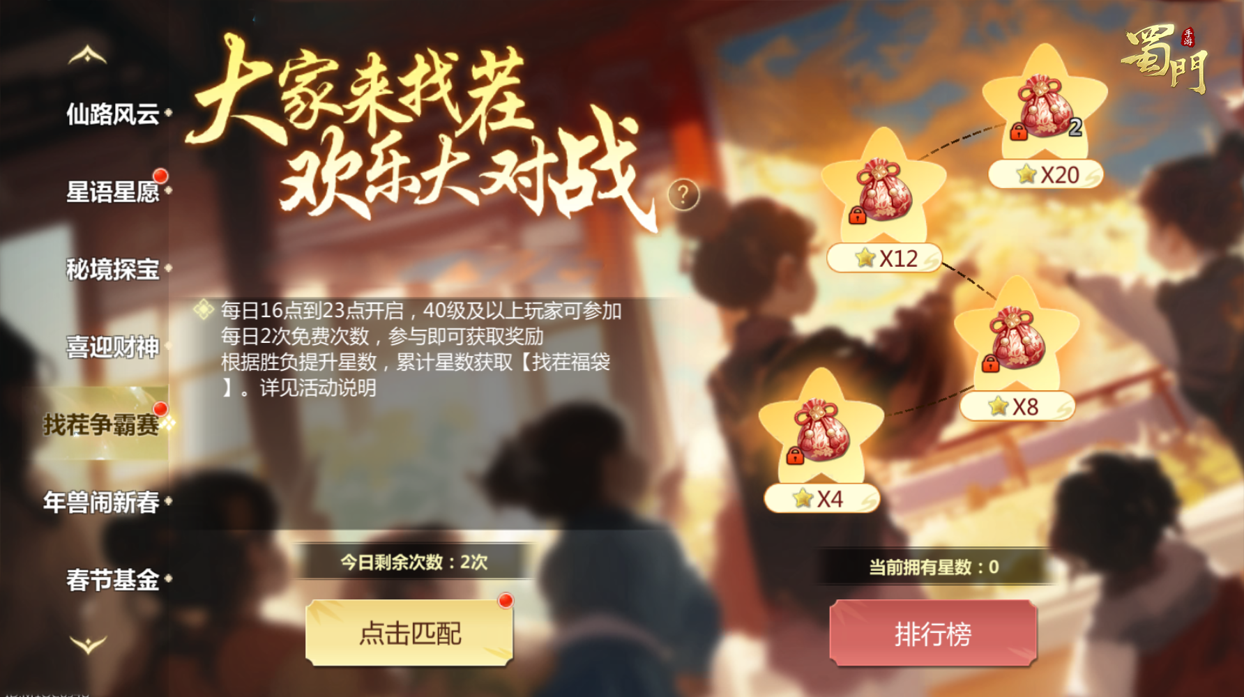 活动内容:限时秘境开启,组队探宝赢好礼!在活动期间,每日16-23点,蜀友们可通过单人或双人组队匹配进入秘境探宝副本,一人控制坐骑一人操控技能,限定时间内收集福袋赢取积分。