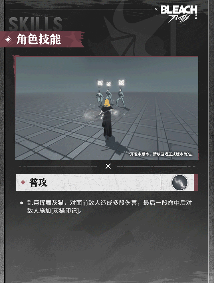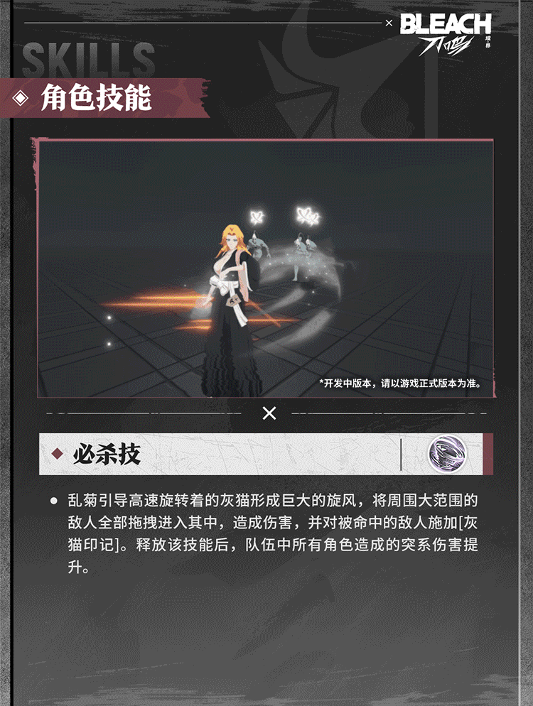 十番队副队长。散发着成熟魅力的妖艳美女。平时把麻烦的工作推给队长到处玩,但由于其性格和很会照顾人,也受到其他队的队员们仰慕。游戏中的乱菊是突系辅助角色,拥有诸多聚怪控制能力,可以大幅改善队伍输出环境。点击下方图片,一起查看乱菊的技能详情吧!*研发中版本,不代表游戏最终品质