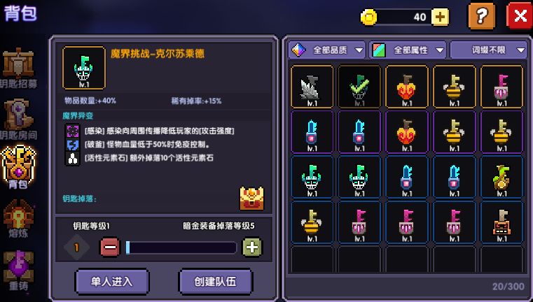 勇者们可以在钥匙背包里对钥匙进行筛选(如图所示),操作简单,方便大众。点击钥匙还会显示钥匙信息,方便后续的重铸、熔炼操作。
