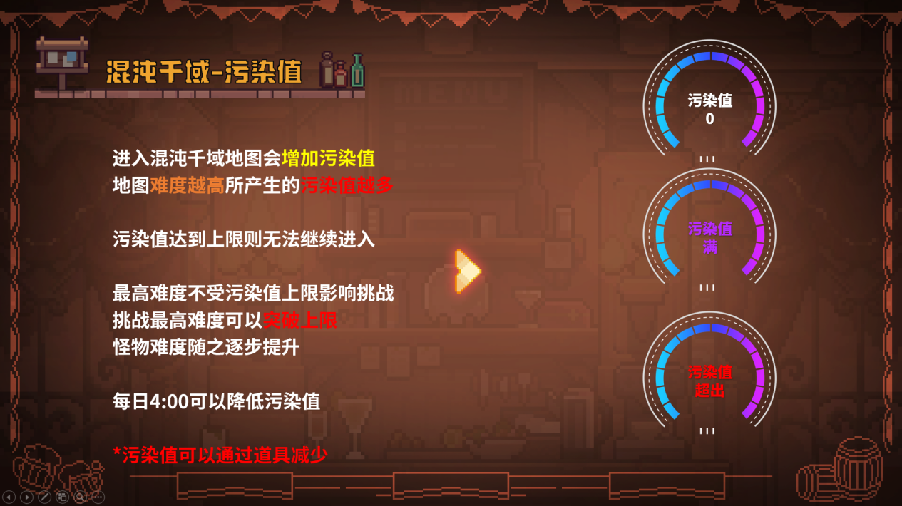 全新污染值机制: 进入副本增加污染值,难度越高,掉落越丰富,污染值增长幅度也会更高。达到上限则无法进入副本。但最高难度副本可以突破污染值上限,怪物也会随污染值突破上限而变得越来越强,挑战你的极限战力。