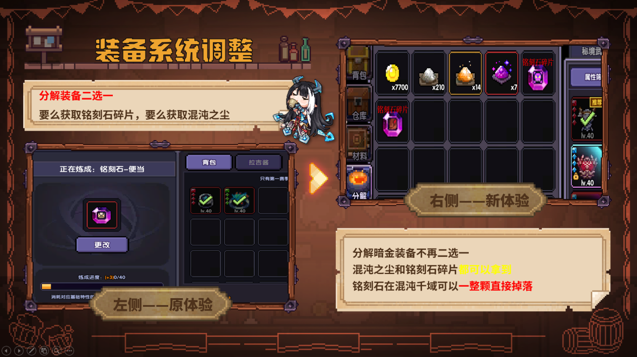 铭刻石改革: 分解装备将同时获得铭刻石碎片和尘,不再需要二选一;铭刻石可以通过混沌千域一整颗产出。