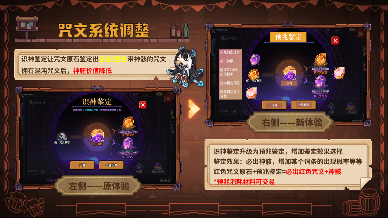 自定义鉴定:识神鉴定调整为“预兆”鉴定,可以通过消耗材料指定任意品质咒文原石必出神骸/增加某个词条的出现概率等等,更大程度上能帮助勇者获取需要的咒文