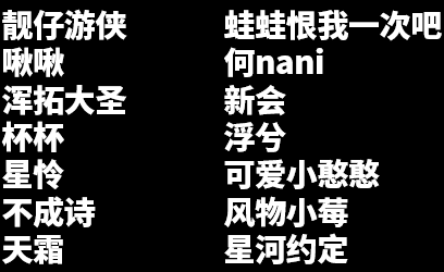 靓仔游侠丨啾啾丨浑拓大圣丨杯杯丨星怜丨不成诗丨天霜丨何nani丨新会丨浮兮丨可爱小憨憨丨风物小莓丨星河约定丨蛙蛙恨我一次吧