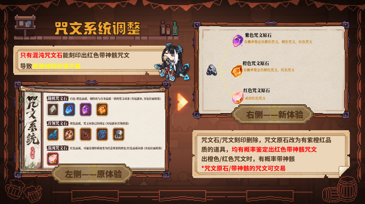 旧的咒文系统过于繁琐,且后期大部分道具的价值较低。在新版本中,我们将对其进行“瘦身”和优化:
