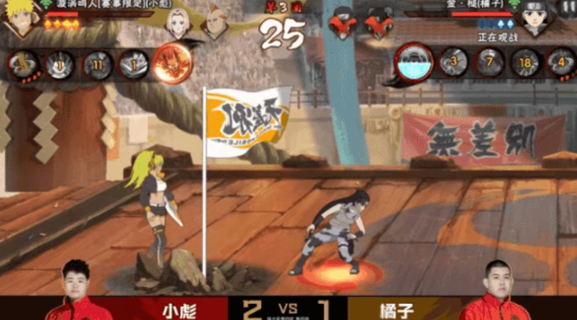 在第四轮第4场小彪橘子的决斗中,新秀选手小彪凭借灵活走位和技能优势,以完美表现连续击败橘子三名忍者,最后小彪以奥义终结橘子拿下胜利,顺利晋级八强!