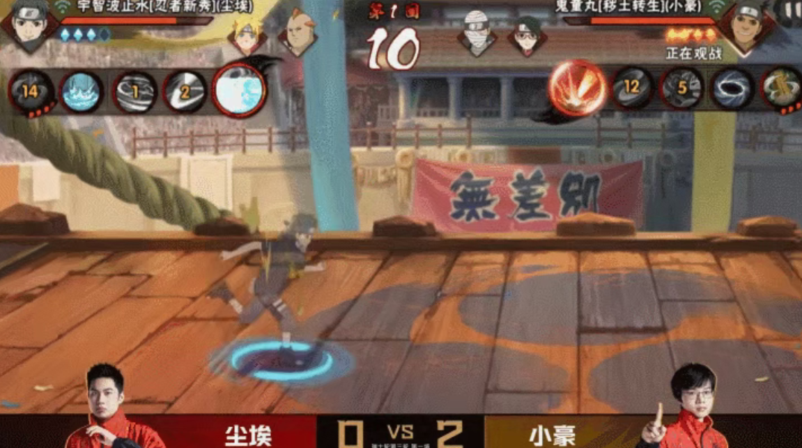 在第三轮第1场小豪尘埃的对决中,小豪的鬼童丸「秽土转生」多次技能先手命中,使用时空间忍术拉开距离;最后小豪的宇智波佐良娜登场终结尘埃,率先晋级八强!