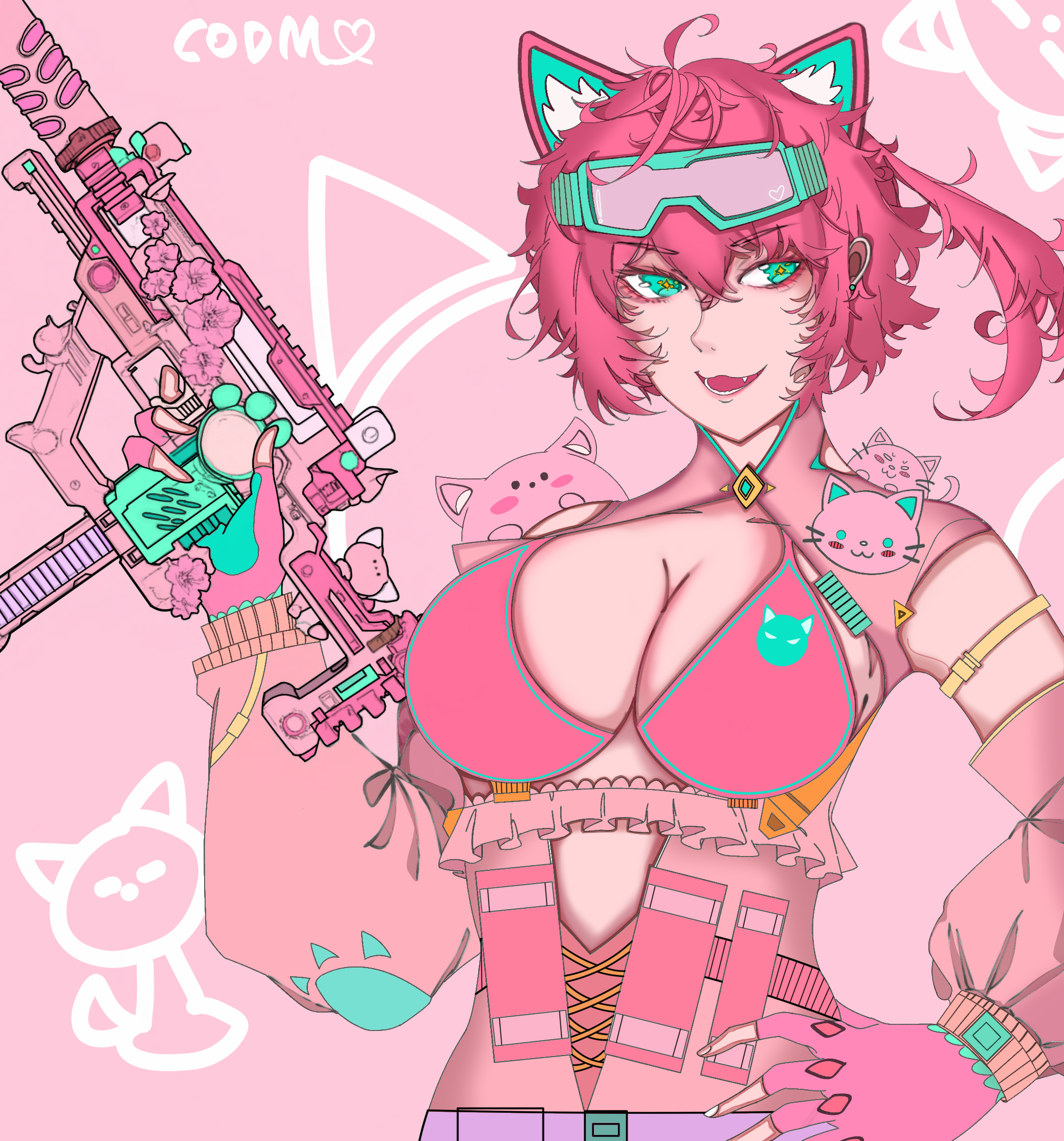 设计创意:MAC-10花仙喵的拟人二创,给角色融入了很多的喵喵元素,比如原枪的绿色猫爪重新做了图案以及枪身的樱花做了图案,角色以黑色为主,原枪的粉绿色作为点缀,角色也佩戴猫爪等喵喵元素。