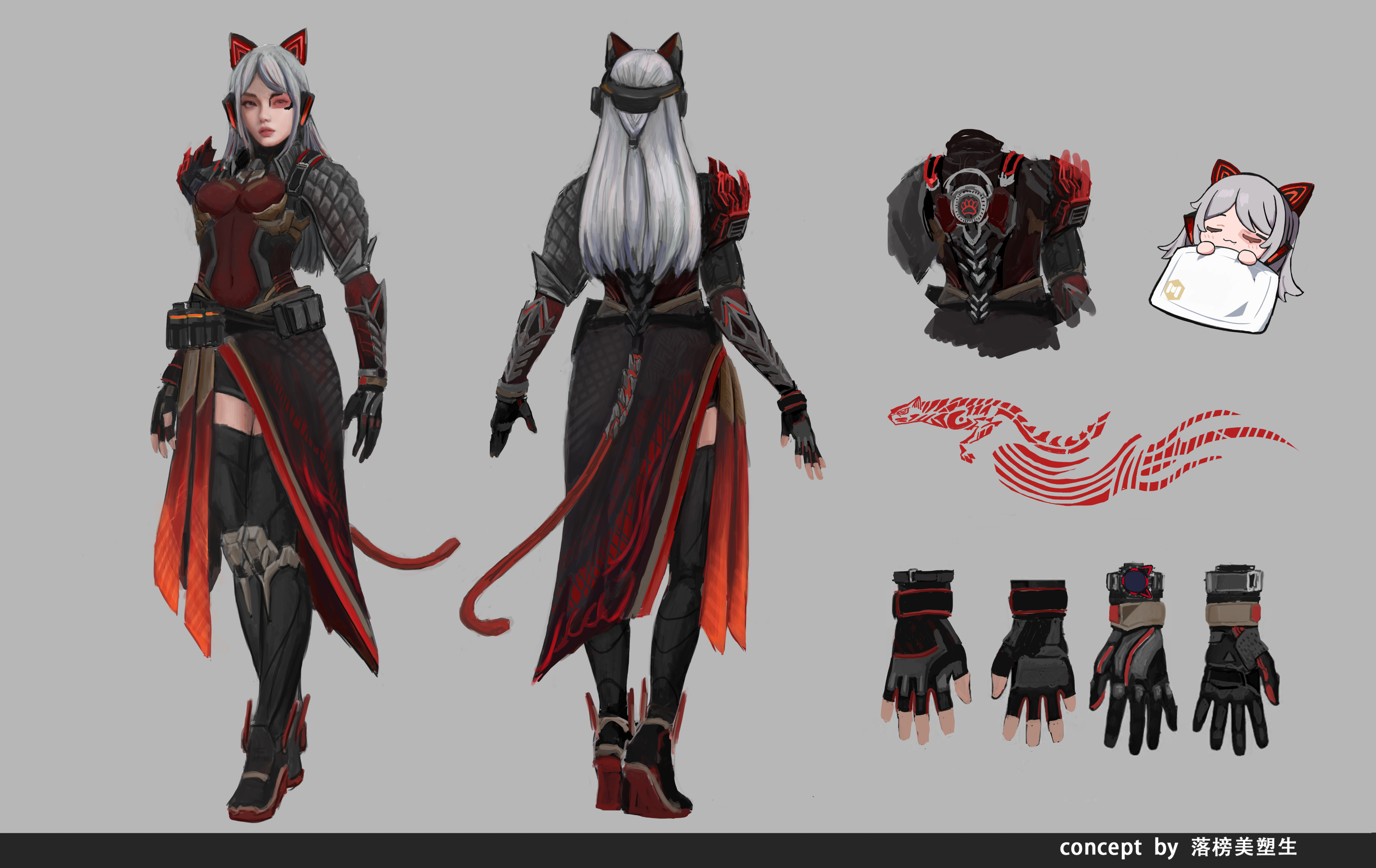 设计创意:提取locus-绯红猫爪相应元素组合成的拟人化角色。首先这个皮肤让我直接联想到“绯红女巫”和“地狱猫跑车”等,由此定下科幻和女性角色的基础。在服装裁切上参考了漫画作品中的裙摆,身上装备大量直接采用皮肤原有设计(肩甲处为弹匣、手表和手臂为瞄准镜……)