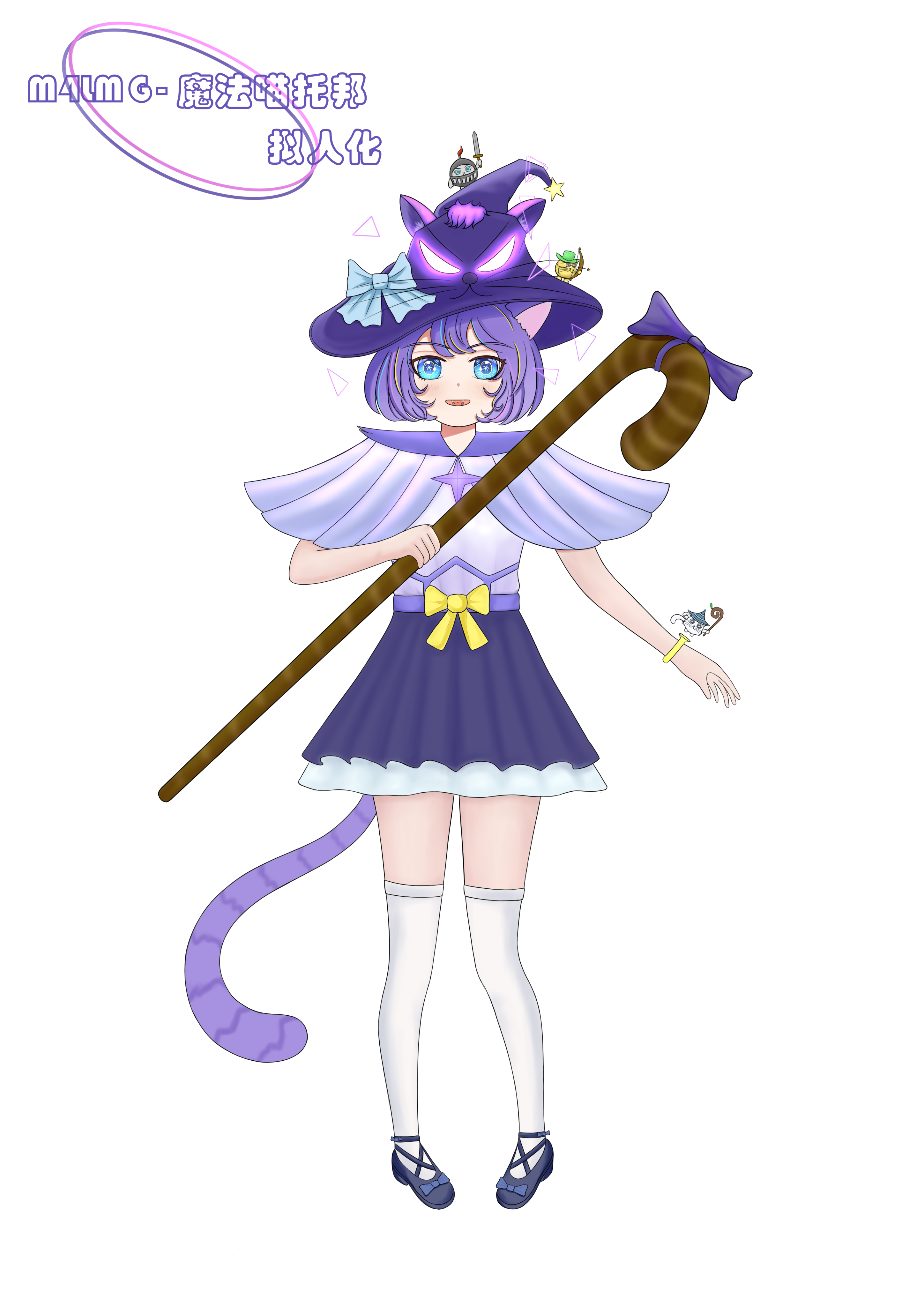 设计创意:M4LMG - 魔法喵托邦武器拟人化形象设计,整体围绕着魔法元素,以枪身的紫色猫咪头像为灵感进行拟人创作,角色头戴有紫色发光猫脸魔法帽,手持魔法杖,将枪上的三只小猫(骑士猫、弓箭猫、魔法猫)融入角色其中并最终创作。