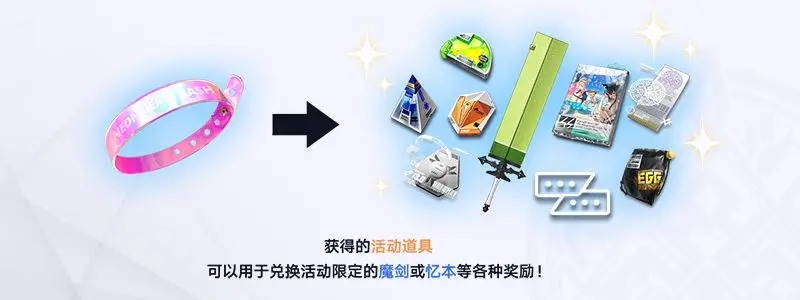 - 使用活动道具「闪耀手环」兑换活动限定魔剑与忆本等丰富奖励喵!