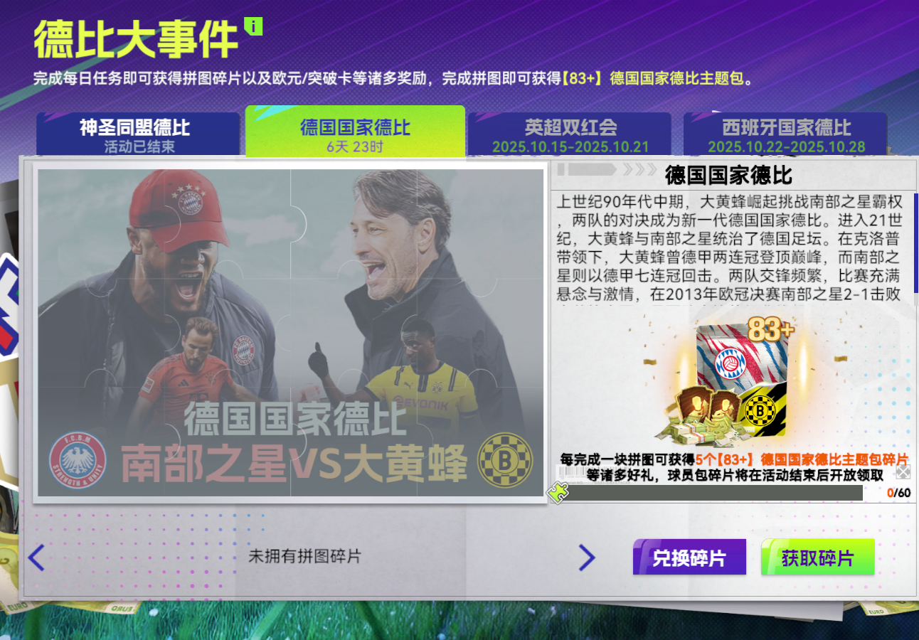 完成每日任务即可获得拼图碎片以及欧元/突破卡等诸多奖励,完成拼图即可获得【83+】德国国家德比球员包。当南部之星与大黄蜂狭路相逢,每一次碰撞都是经典!现在参与活动收集碎片,拼齐德甲最热血的对决故事!