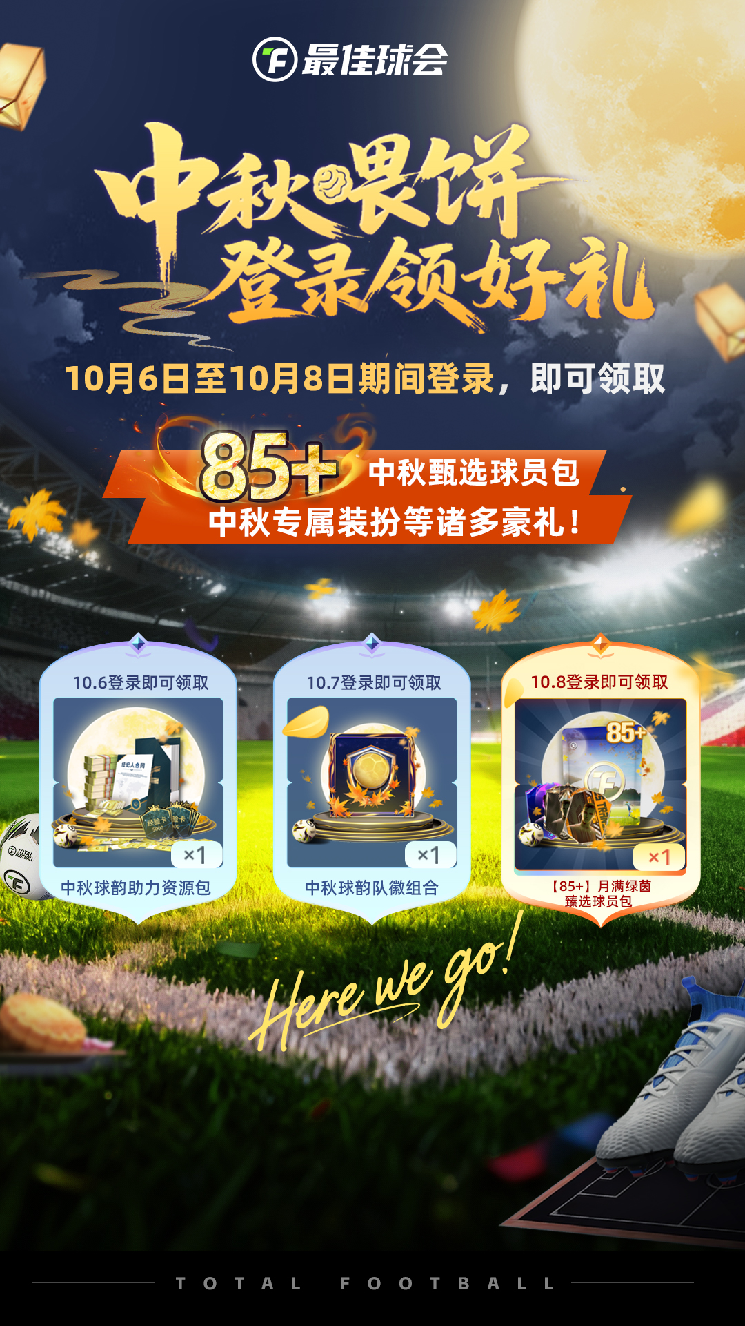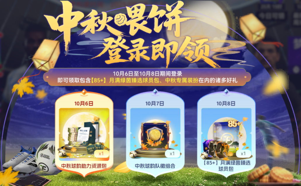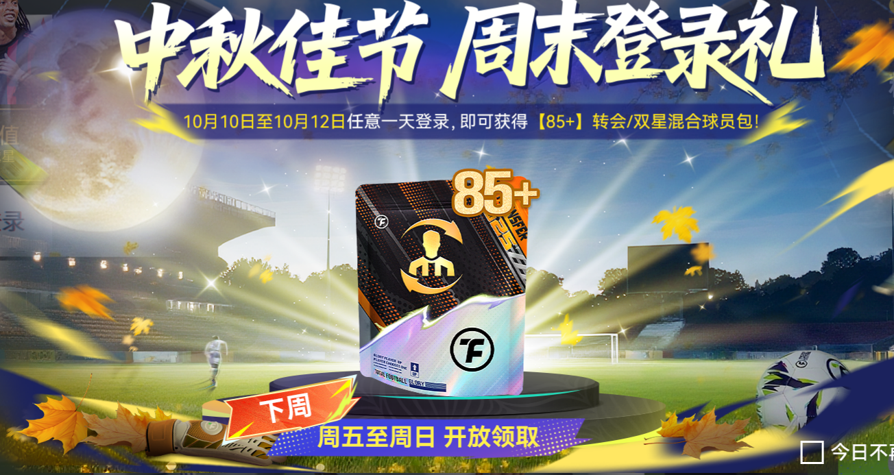 10月10日至10月12日任意一天登录,即可获得【85+】转会/双星混合球员包!月圆人团圆,周末福利送不停!只需点击登录,豪礼就能收入囊中,记得上线补强你的秋日闪耀阵容!