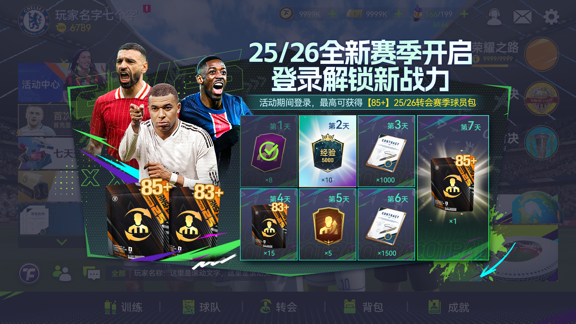 活动期间累计登录,即可获得包含【85+】转会主题混合球员包在内的诸多豪礼。新的赛季,新的球员,新传奇的启航。每一次登录,都是向更强战力迈进的一步。参与累计登录活动,助力你的球队在这个赛季里焕然新生!