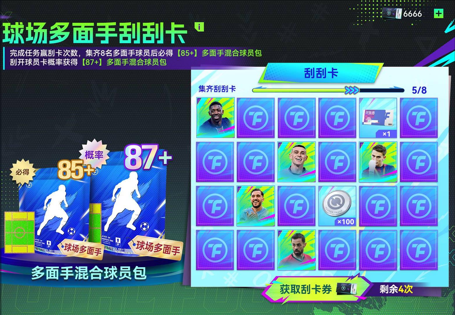 完成任务赢刮卡次数,集齐6名多面手球员后必得【85+】多面手混合球员包,刮开球员卡概率获得【87+】多面手混合球员包。攻守兼备,随时填补任何空位的球场多面手,才是球队阵容的真正基石。每一次刮卡,你都有机会迎来一位无所不能的“全能战士”!